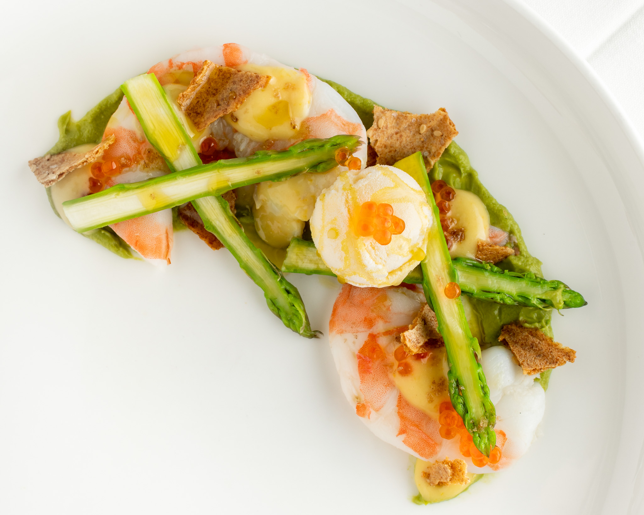 Asparagus, Avocado, Smoked Trout Roe, Sourdough Ice Cream, Benne Seed Cracker